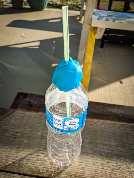 Feel free to use either playdough or clay to mold around the bottle opening to prevent air from escaping. The bottle can then be squeezed to mimic the action of blowing air from your lips.