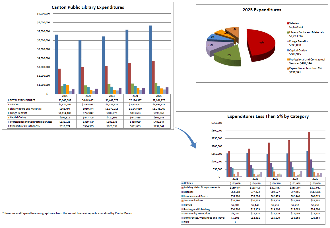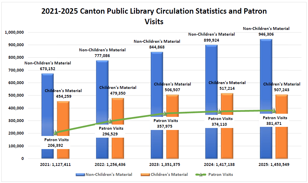 The Canton Public Library is committed to transparency in all of its operations. This dashboard is intended to provide our community with a snapshot of the library’s 2025 financials, usage, and collection. We continue expanding digital access, including purchasing more streaming and digital content and partnering with other libraries in Michigan to share our e-media, expanding options for our patrons. We continued to invest in the facility by adding more comfortable seating areas for studying and relaxing, including the addition of a new Open Study Space in the southern part of the building and a larger New Arrivals area to help meet demand from our community.
