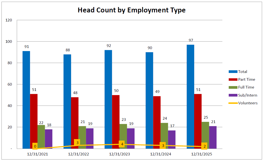 The library employed a total of 97 staff members throughout 2025. There were 2 total volunteers who offered their time to work at the library.