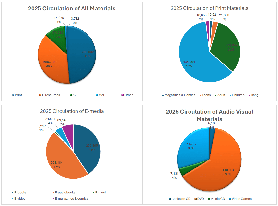 Patrons checked out a total of 1,453,549 items (like books) and checked out 556,328 electronic materials, including e-books. Of the items checked out, 12% were audio visual materials. Circulation of print materials included 62% children's books and 32% adult books.
