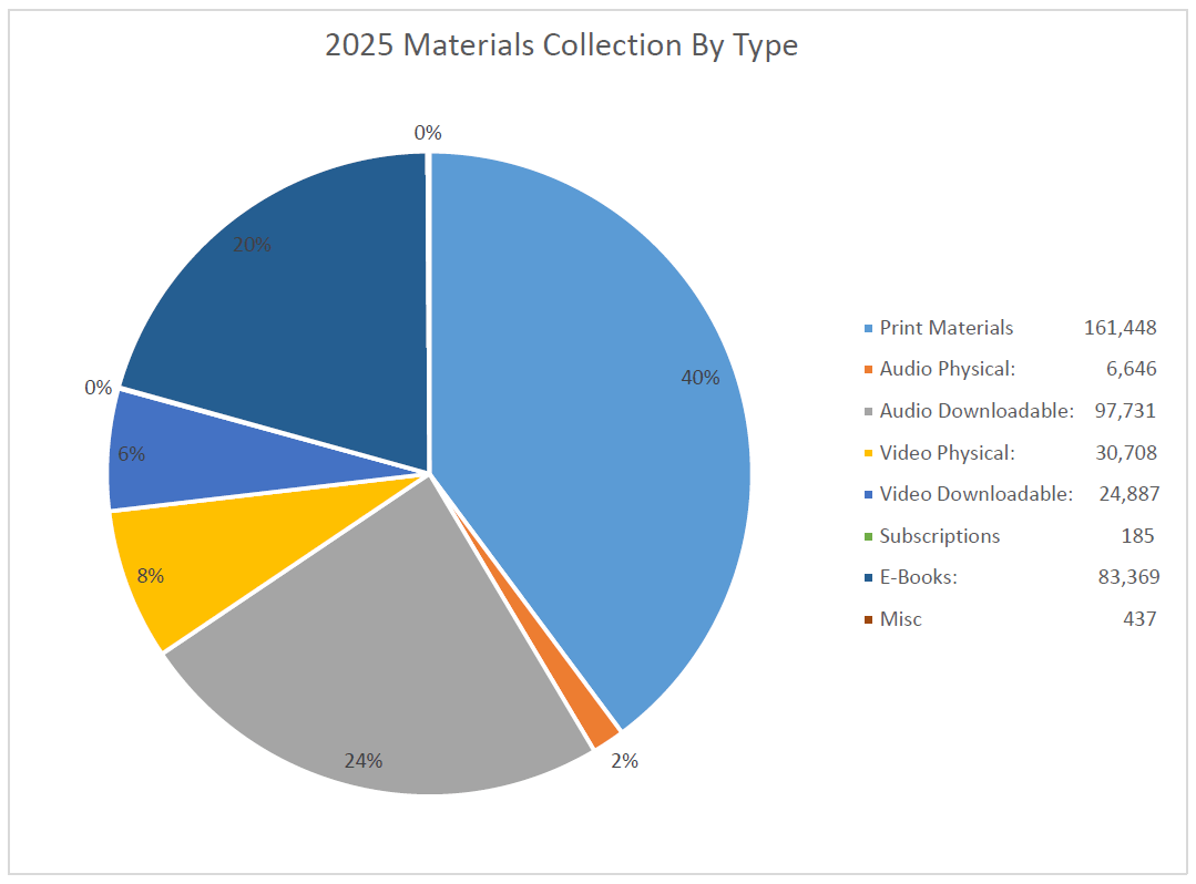 The library has 405,411 items in the collection. At the library, 40% of items are print materials and 8% are DVDs. The library has 205,987 electronic materials, including 83,369 e-books.