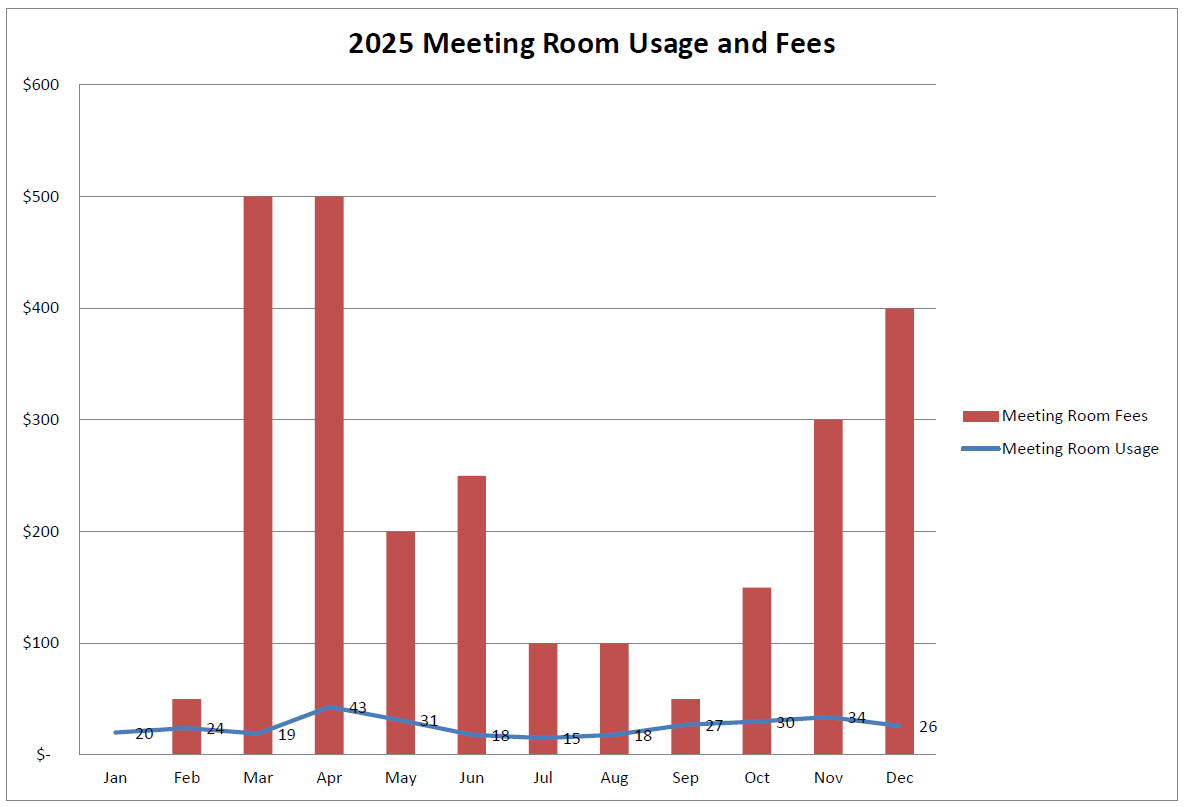 The library meeting rooms were used outside of library-sponsored programs 305 times over the course of the year.