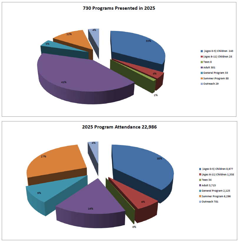 The library held a total of 730 programs, with 22,986 people in attendance. Of those programs, 271 were children's programs, and 88 programs were a part of 62 Days of Summer.