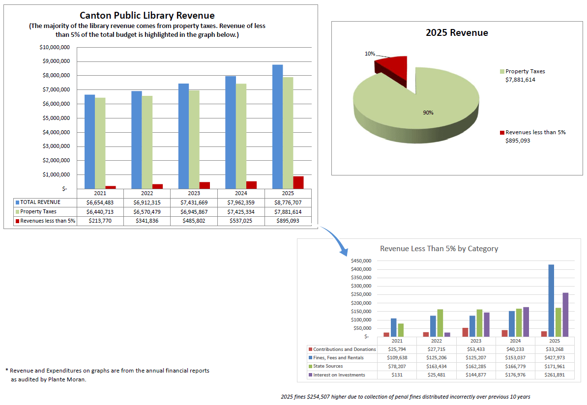 The library's total revenue for 2025 was $8,776,707. The majority of revenue comes from property taxes. The library received $7,881,614 in property taxes.